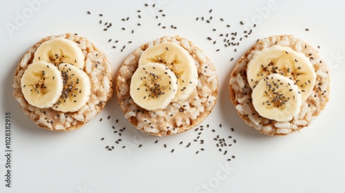 Three rice cakes topped with peanut butter, banana slices, and chia seeds.