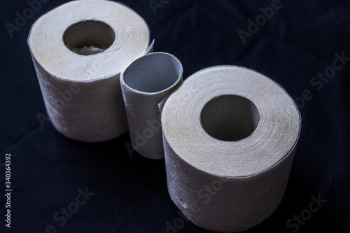 Three rolls of single-layer and thin toilet paper on a black background, two whole rolls