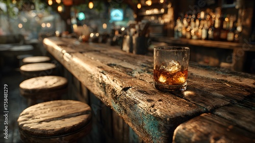 Three rustic wooden bar stools stand at a weathered bar top in a moody tavern, with a single glass of amber whiskey on the counter.