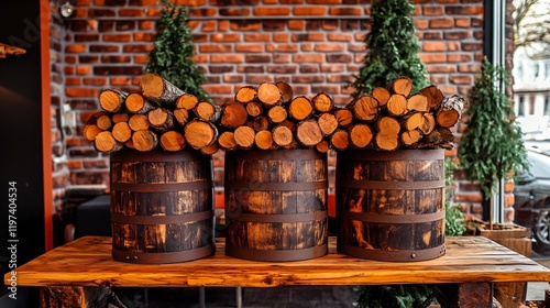 Three Rustic Wooden Barrels Filled with Firewood Logs