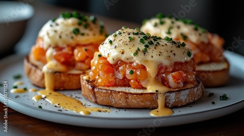 Three salmon toast appetizers topped with cream and chives on a plate.