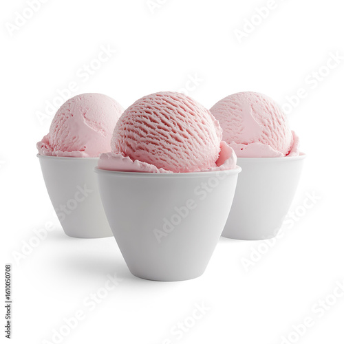 Three scoops of pink strawberry ice cream in bowls on a Transparent Background
