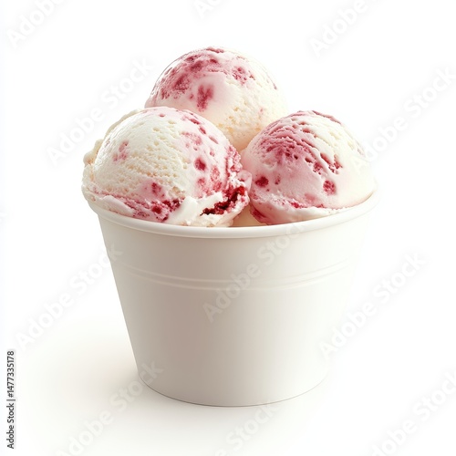 Three scoops of vanilla ice cream with raspberry swirl in a white paper cup