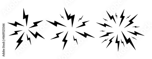 Three sets of black and white abstract lightning bolt bursts radiating outwards thunder