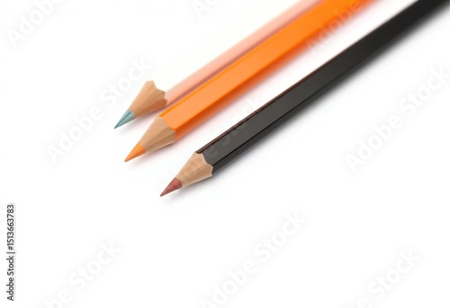 Three sharpened pencils, white, orange, and black, neatly arranged on a pure white background, isolated, tools