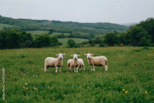 Three sheep are standing in a grassy field