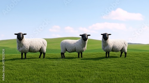 Three sheep standing on a green grassy field under a blue sky.