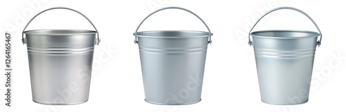 Three Silver Buckets with Metal Handles in Row Isolated on transparent background