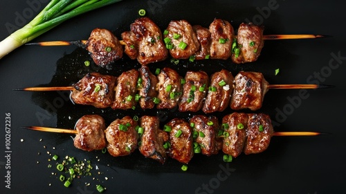 Three Skewers of Glazed Meat with Green Onions