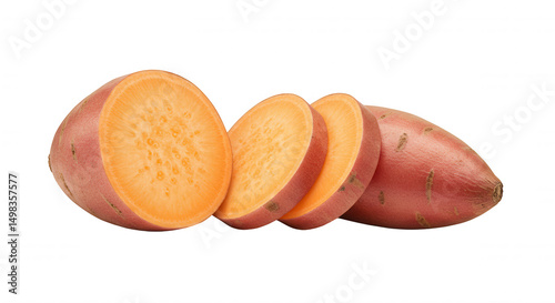 Three sliced sweet potatoes arranged diagonally on transparent background