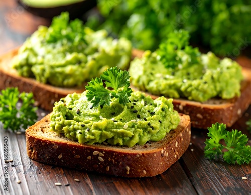 Three slices of toast topped with vibrant green avocado spread. Parsley sprigs and black sesame seeds adorn the creamy mixture. Dark wood surface