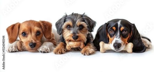 Three small dogs lying down side by side each holding a bone-shaped biscuit in their mouths, looking calmly at the camera against a white background