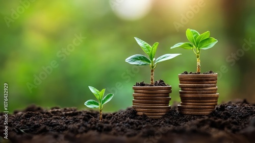 Three small plants growing in a pile of coins, representing the concept of financial growth.