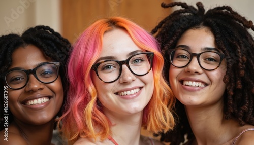 Three smiling friends share laughter, good times. Diverse young women with bright hair colors, stylish glasses enjoy vibrant daytime setting. Casual attire, expressions convey genuine happiness,