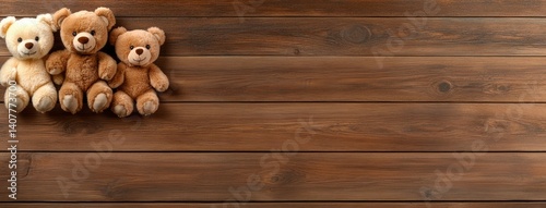Three soft and cuddly plush teddy bears are arranged adorably on a rustic wooden table, basking in the warm light of a cozy indoor setting during daylight hours