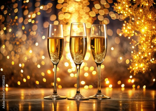Three Sparkling Champagne Glasses with Golden Bokeh for Festive Celebrations, Perfect for New Year, Weddings, and Parties