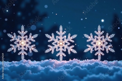 Three sparkly snowflakes in a row against a dark blue winter sky, glimmering, night