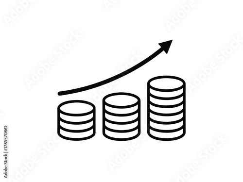Three Stacks of Coins with Upward Arrow Icon on White Background Keywords: coin, coins, money, currency, finance