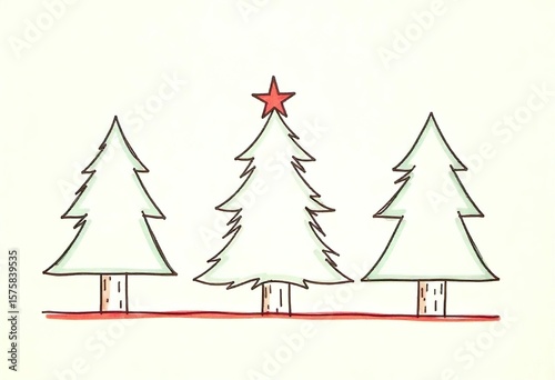 Three stylized Christmas trees, against a white background, creating a whimsical, hand-drawn aesthetic. Christmas card or a simple graphic design element. Flat design, cartoonish, line art, outline