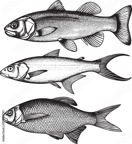 Three stylized fish illustrations in a linear style.