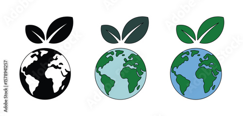 Three stylized icons of planet earth with green leaves symbolizing environmental protection and sustainability