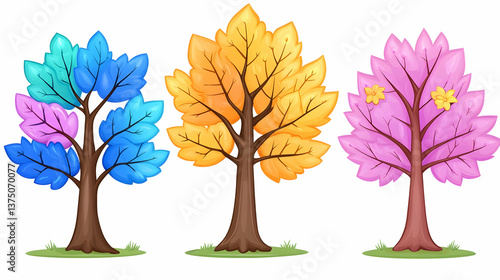 Three stylized trees in blue, orange, and pink, representing seasons . AI generative