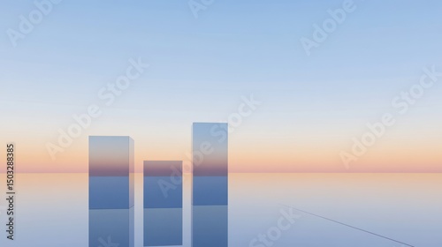Three translucent rectangular shapes reflect in a calm body of water under a soft pastel sky.