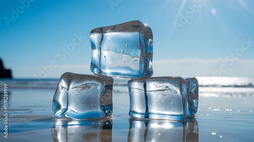 Three transparent ice cubes stacked on the beach reflecting sunlight and the ocean backdrop