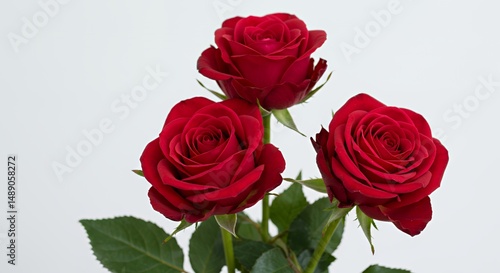 Three Velvety Red Roses Bloom with Verdant Leaves Against White Backdrop Perfect for Valentine's Day Weddings and Anniversaries