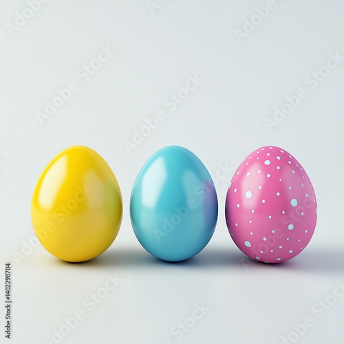 Three vibrant Easter eggs in yellow, blue, and pink polka dots, arranged in a simple row against a clean white background.