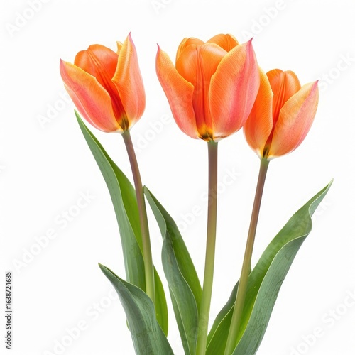 Three vibrant orange-red tulips, close-up, on a white background