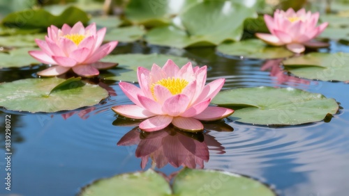 Three vibrant pink water lily flowers with bright yellow centers bloom in tranquil blue pond water.