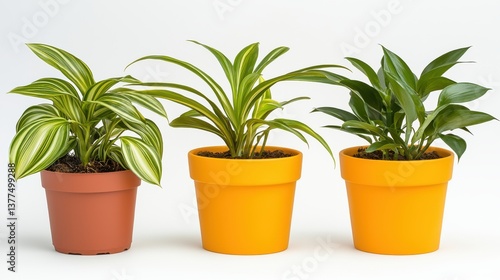 Three vibrant potted houseplants with variegated leaves sit in terracotta and yellow pots against a bright white background perfect for home decor and interior design.