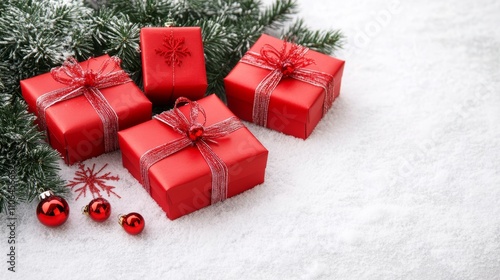 Three vibrant red presents adorned with shiny ribbons sit amidst a joyful array of festive Christmas decorations, radiating warmth and holiday cheer.