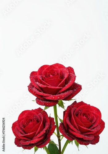 Three vibrant red roses covered in fresh water droplets, elegantly isolated against a pure white studio background, symbolizing passion ,fresh ,gift ,valentine