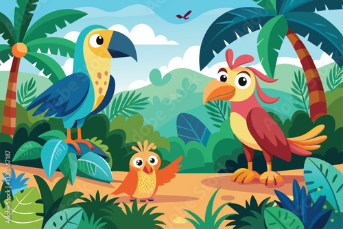Three vibrant tropical birds playfully interact amid lush greenery and palm trees in a sunny jungle, Tropical birds Customizable Cartoon Illustration