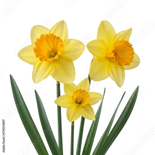 Three vibrant yellow daffodils isolated on white background, capturing the essence of spring and the beauty of floral arrangements