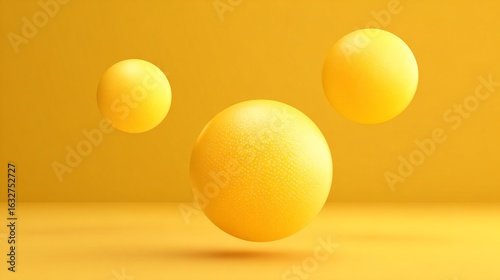 Three vibrant yellow spheres hover against a matching background, creating a minimalist, yet captivating visual composition