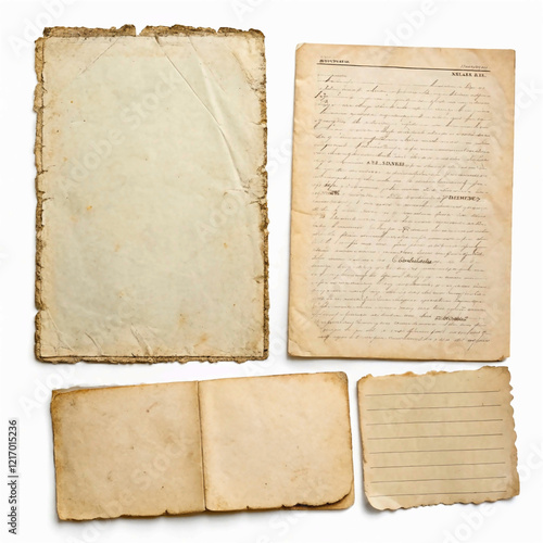 three vintage and antique paper textures, stained g with ripped / torn edges and old French ledger paper isolated on white a background, blank textured sheets as backgrounds or paris, shabby, chic, li