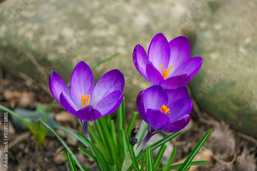 Three violet crocuses in early spring garden. Close-up of flowering crocuses Ruby Giant on natural background. Soft selective focus.