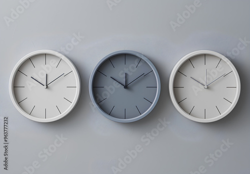 Three wall clocks with simple designs, each featuring two hands and one white face in the center of which is a single line representing time, creating an atmosphere of calmness and minimalism.