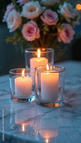Three white candles in glass holders on marble table. Blurred floral background with pink roses, soft bokeh lights. Warm glow creates romantic peaceful ambience. Evening decor, comfort, hope, memory.