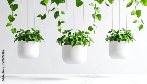 Three White Ceramic Plant Pots Suspended With Lush Green Foliage Against Clear White Backdrop