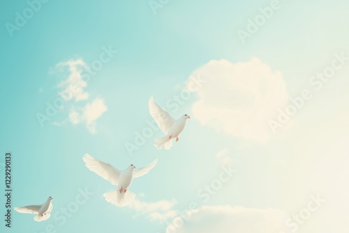 Three white doves gracefully soar across a clear blue sky, surrounded by soft, fluffy clouds. The minimalist composition emphasizes the elegance and freedom of the birds in flight