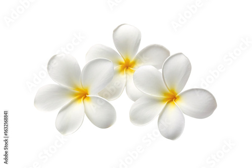 Three white frangipani blossoms with golden yellow centers arranged in triangular formation showing delicate petals, isolated on a transparent background