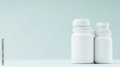 Three white, unlabeled pill bottles sit on a pale teal surface. A larger bottle is flanked by a smaller bottle and a lidded container. The image features soft lighting and a minimalist aesthetic. The