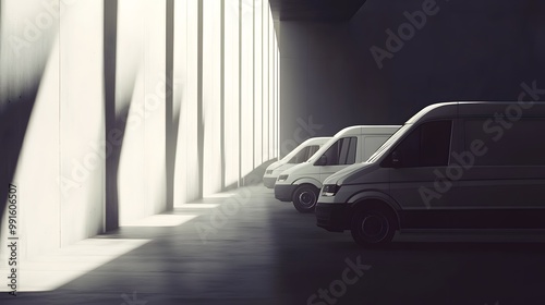 Three White Vans Parked In A Dark Garage With Light Streaming In