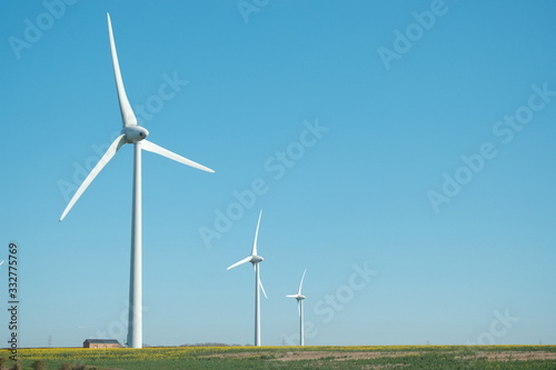 Three wind turbines in a field of yellow flowers on a clear summers day.