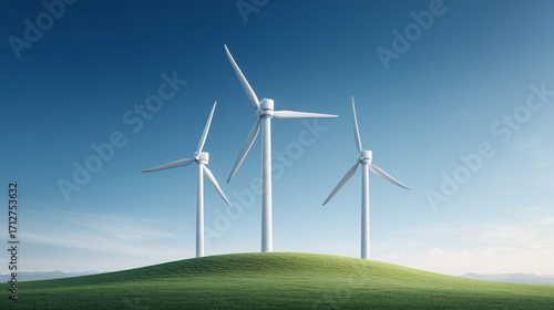 Three Wind Turbines on Green Hill Under Blue Sky