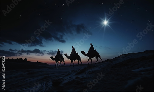 Three wise men riding camels in the desert under the night with one bright star. In the beautiful night sky. AI generated images.